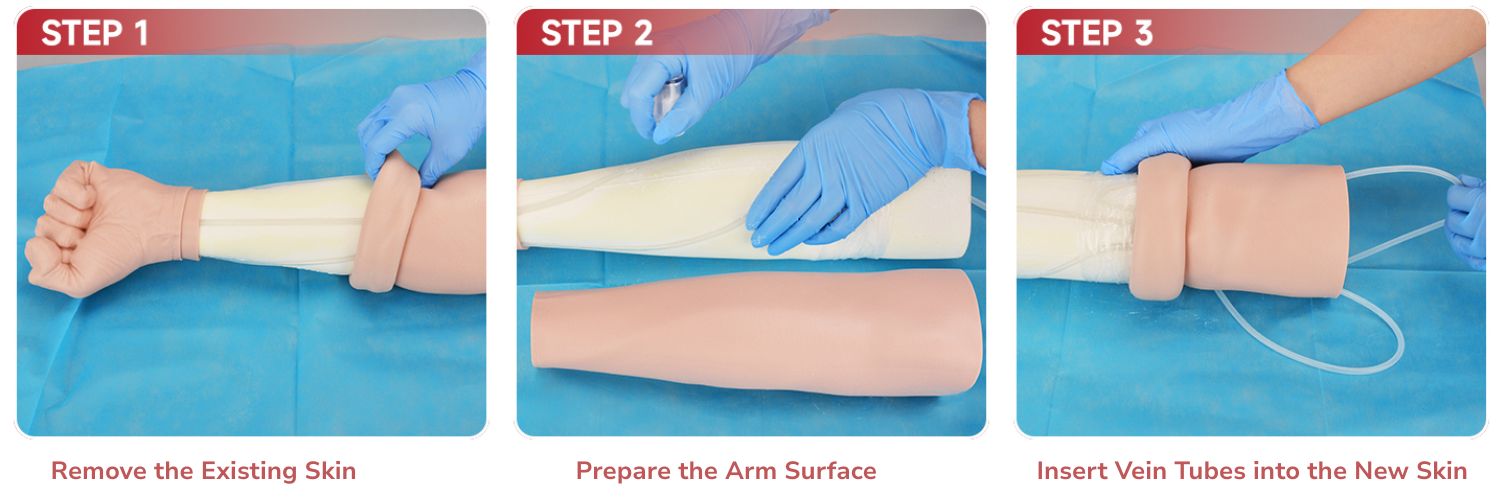 By following these steps, you can quickly replace the skin and veins, extending the arm's lifespan and ensuring realistic venipuncture and IV training sessions.